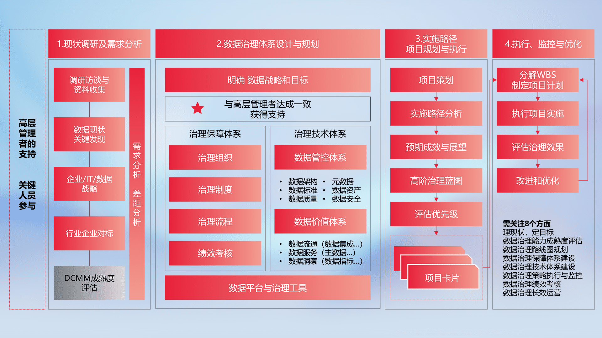 制定并执行统一的数据标准,,,规范数据定义和格式,,,消除冗余和不一致性,,,,实现跨部门和跨系统的数据一致性,,,为企业提供标准化的数据基础。。。。